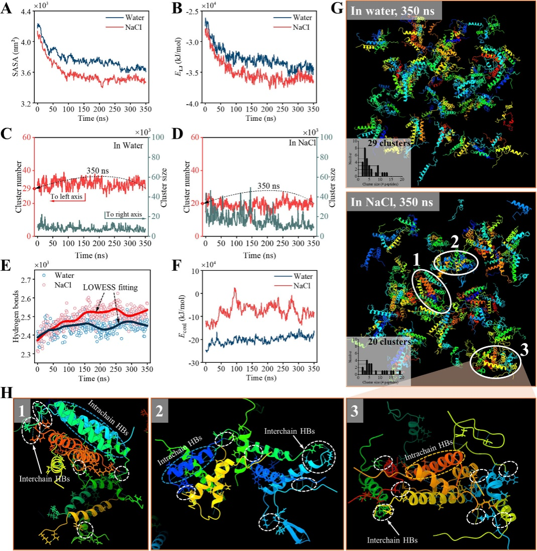 图3水溶液与氯化钠溶液中0-350纳秒分子动力学模拟的肽聚集动力学、热力学及结构分析。