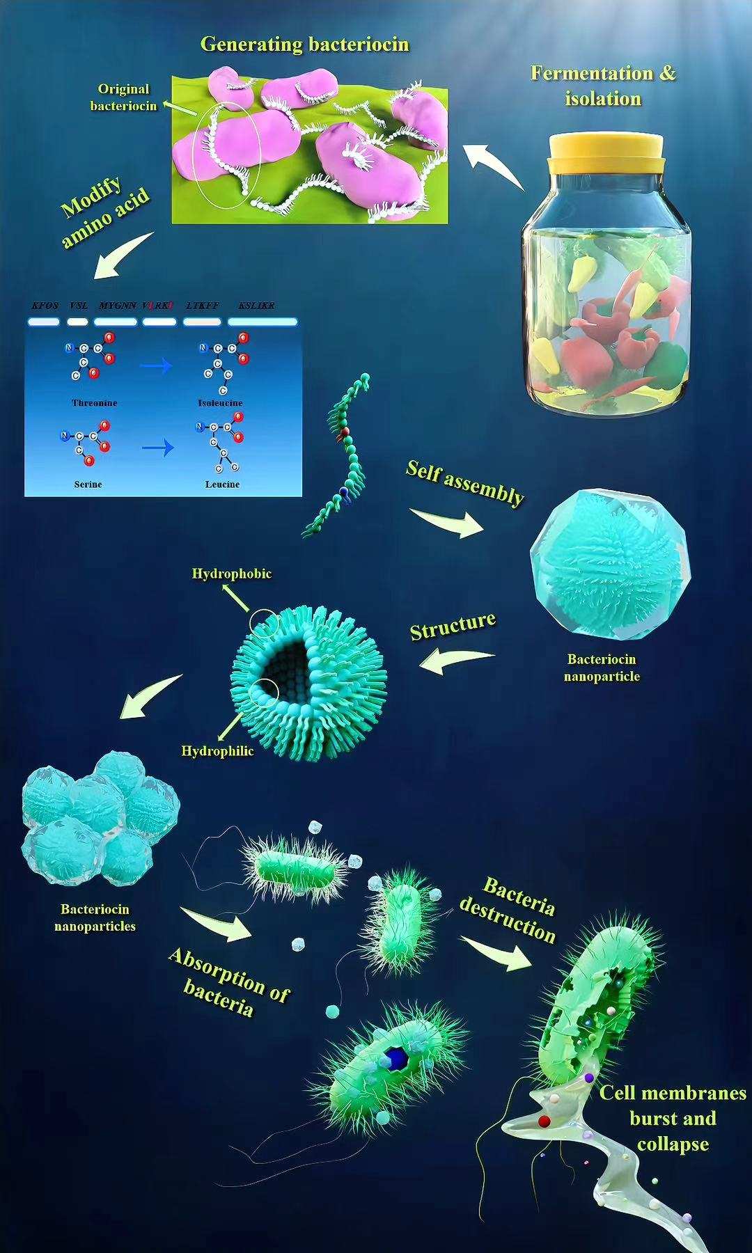 图1概要示意图。该示意图展示了源自发酵食品泡菜中乳酸菌(LAB)的细菌素的整体概况,涵盖多个关键方面,包括细菌素的生成、修饰、结构、自组装成纳米颗粒的过程,以及细菌素纳米颗粒的抗菌机制。