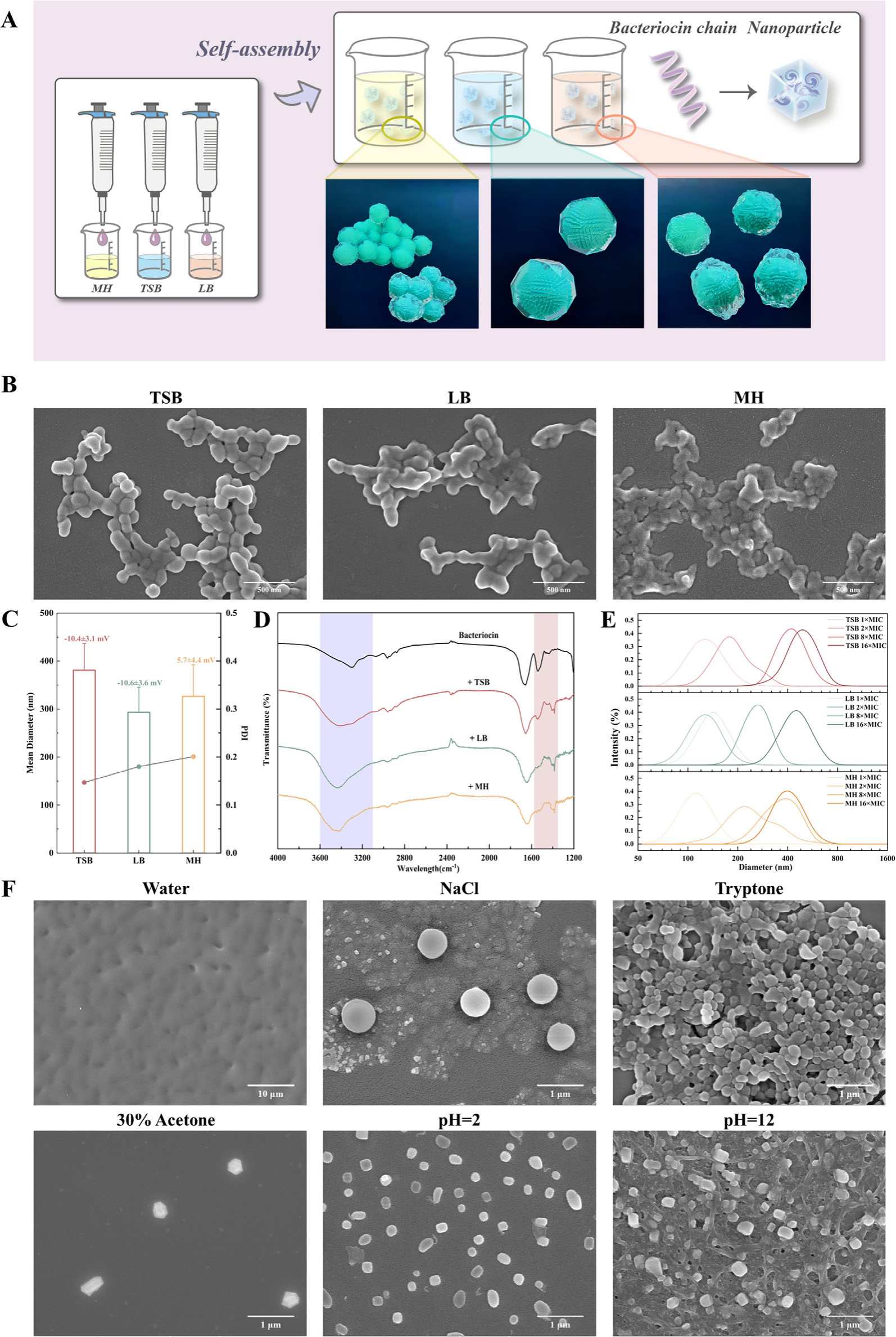 关键发现:这种改造后的细菌素无需任何载体,在常见培养基(如TSB、LB、MH)中即可自发组装成纳米级抗菌颗粒,即便在简单的NaCl溶液中也能发生自组装,将其命名为纳米抗菌细菌素(NAMBs)。实验和分子动力学模拟共同证实,培养基中的NaCl和蛋白胨可通过屏蔽电荷排斥、增强疏水作用和氢键网络,显著促进细菌素的自组装过程,使其形成尺寸均一、结构稳定的纳米颗粒。