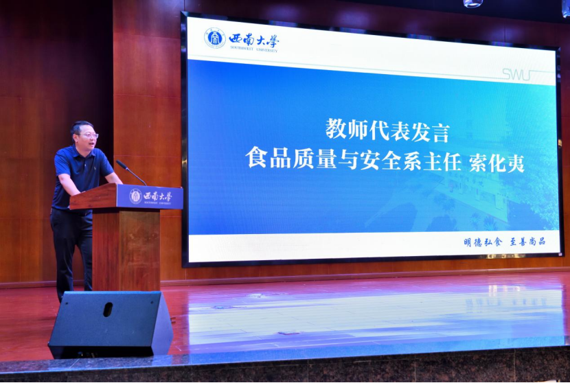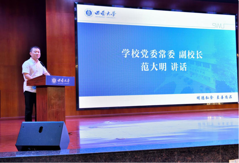 最后,学校党委常委、副校长范大明发表讲话。他围绕大学、西南大学、西南大学食品科学学院三个关键词,指出大学生要转变学习思维方式,形成自己的学习方式和认知能力。要拓宽思维,主动了解大学文化底蕴,推动学科融合发展。要有“食品人”的自信,主动担当作为,锤炼本领,成为有理想,有担当的食品人。